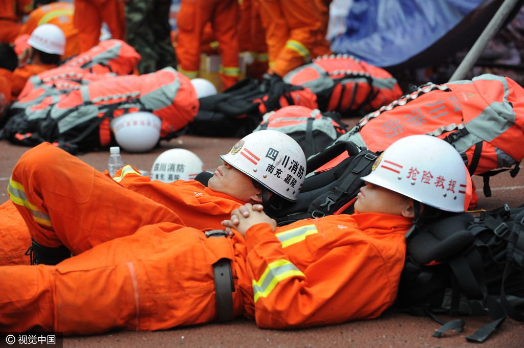 2013年4月22日,四川宝兴县城体育场,消防战士倒地就睡。
