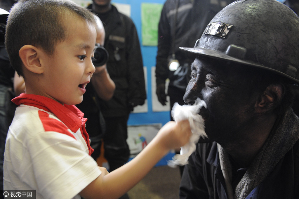 2011年6月16日,山西介休,一名男孩正为刚刚升井的矿工父亲擦去脸上的煤灰。当日,山西焦煤集团汾西矿业新峪公司煤矿在“父亲节”来临之际开展亲情安全教育。