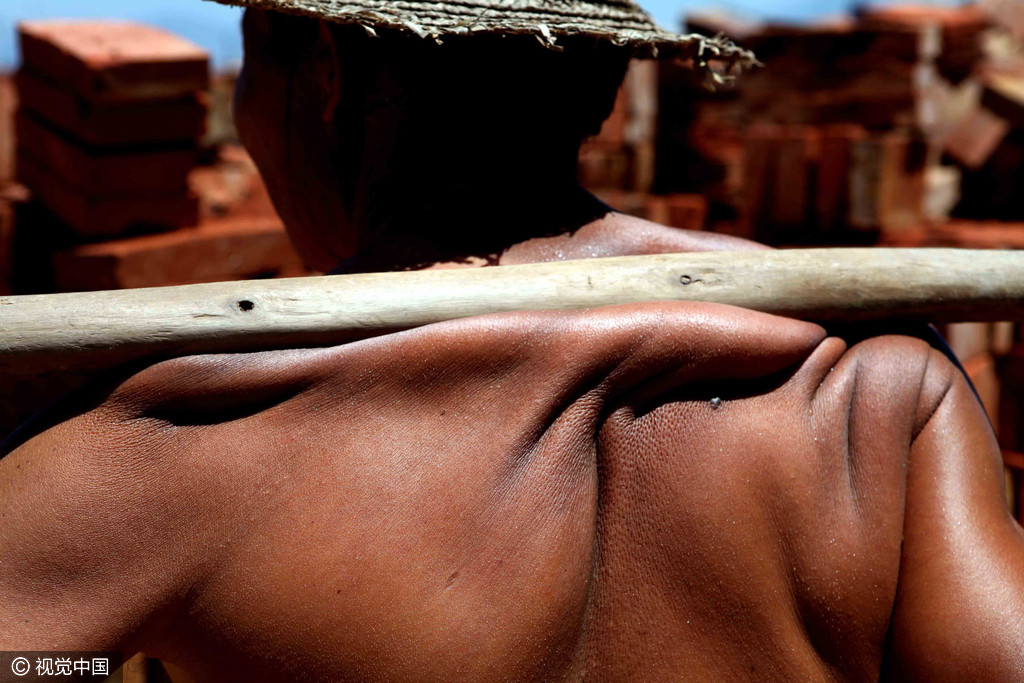 2009年7月9日,深圳宝安区西乡码头,靠扁担卸砖的工人。重重的砖头压在刘外合肩上,肌肉都扭曲了。