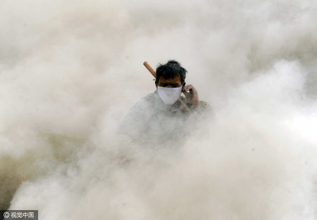 2012年9月14日,新疆阿克苏一碎石厂,铲车过后,一名工人被粉尘包围,无法张开眼睛。
