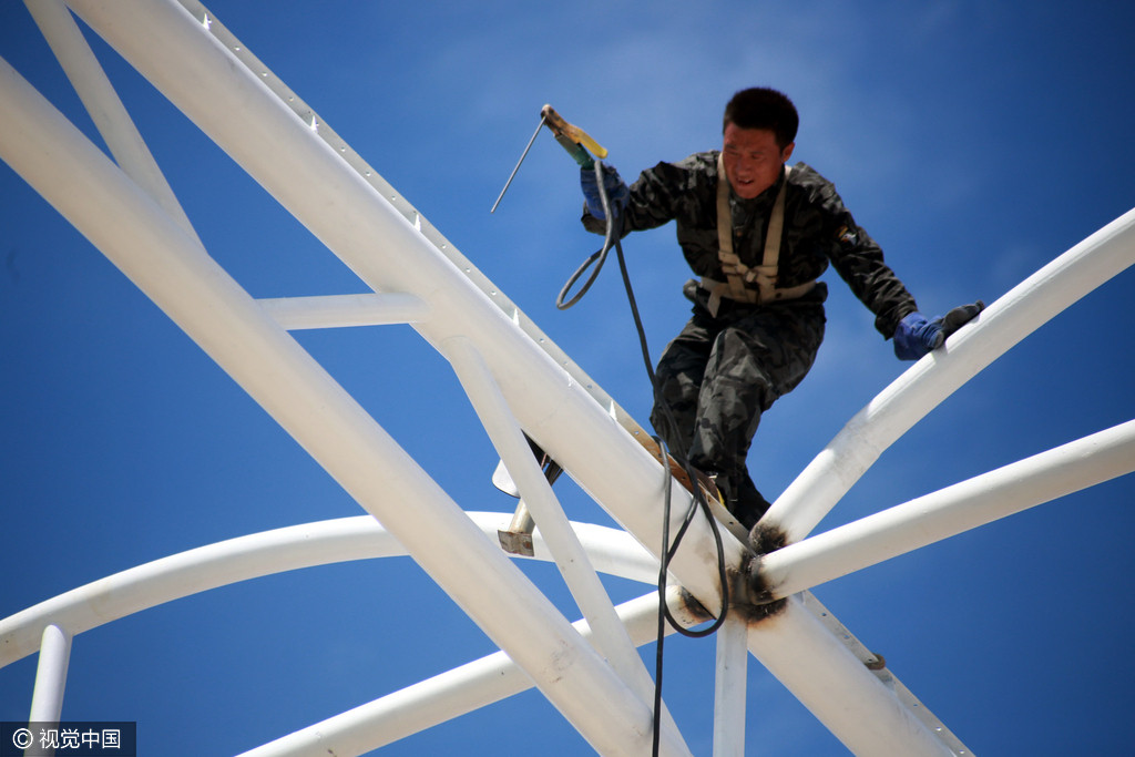 2013年07月25日,江西省九江市,庐山区第一中学项目工地,江庆涛在烈日下小心翼翼地行走在体育馆看台钢架上