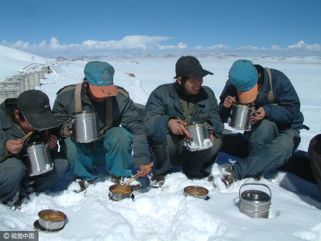 2004年10月,青藏铁路工地上建筑者正在用餐。