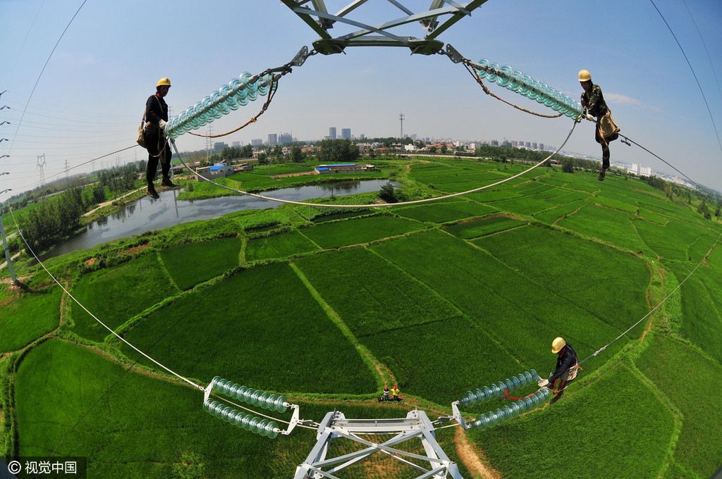 2013年7月24日,在安徽省明光市明东村,电力工人冒着39摄氏高温在70多米的高空检修供电线路。