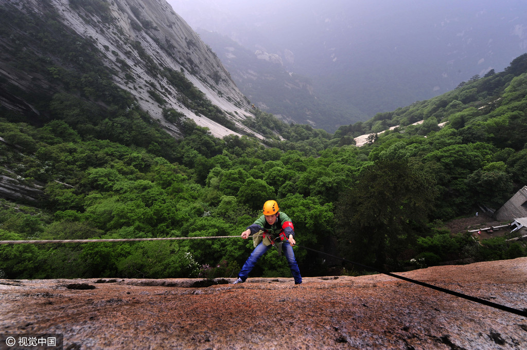 2012年5月10日,陕西华山金锁关,一名环卫工正向悬崖下移动。