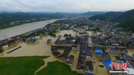 6月19日8时至20日4时,受气象因素影响,湖南龙山县中、北部区域出现强降雨过程。以出土大量秦简名扬海内外的龙山县里耶古镇堤防于20日15时许发生漫溃。此次强降雨共造成龙山县12个乡镇92村4.87万人受灾,紧急转移人口0.323万人,房屋受损48间,直接经济损失7300余万元。目前没有人员伤亡。图为航拍龙山里耶水灾。 陈宇驰 摄