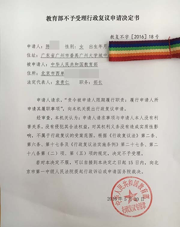 据此,秋白就行政复议不被受理再次状告教育部,于6月14日再获立案。