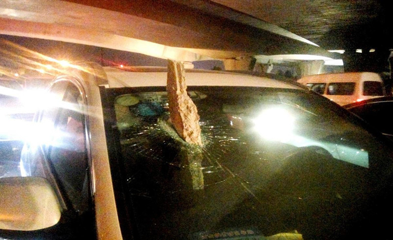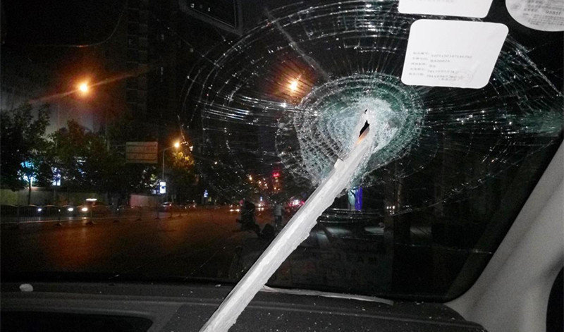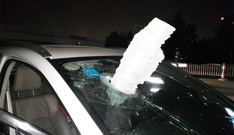 2016年6月27日,河南郑州,晚上20点多,一名女子驾车自东向西行至东风路中州大道立交桥下时,突然从上面掉下一个水泥块,径直砸穿副驾驶上面的挡风玻璃。女司机第一次经历这种场面,直接吓晕。