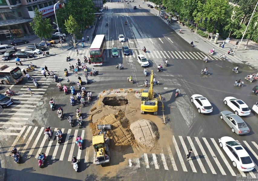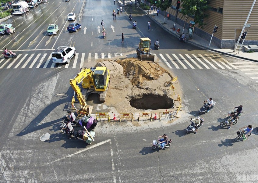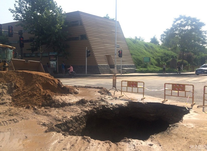 郑州一自来水管爆裂 路面塌陷出现深坑 A